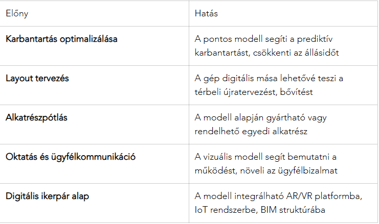 Döntéstámogatás: Egy layout átalakításnál a modell segít megérteni, hogyan illeszkedik a gép a térbe, milyen akadályok, hozzáférési pontok, biztonsági zónák vannak.